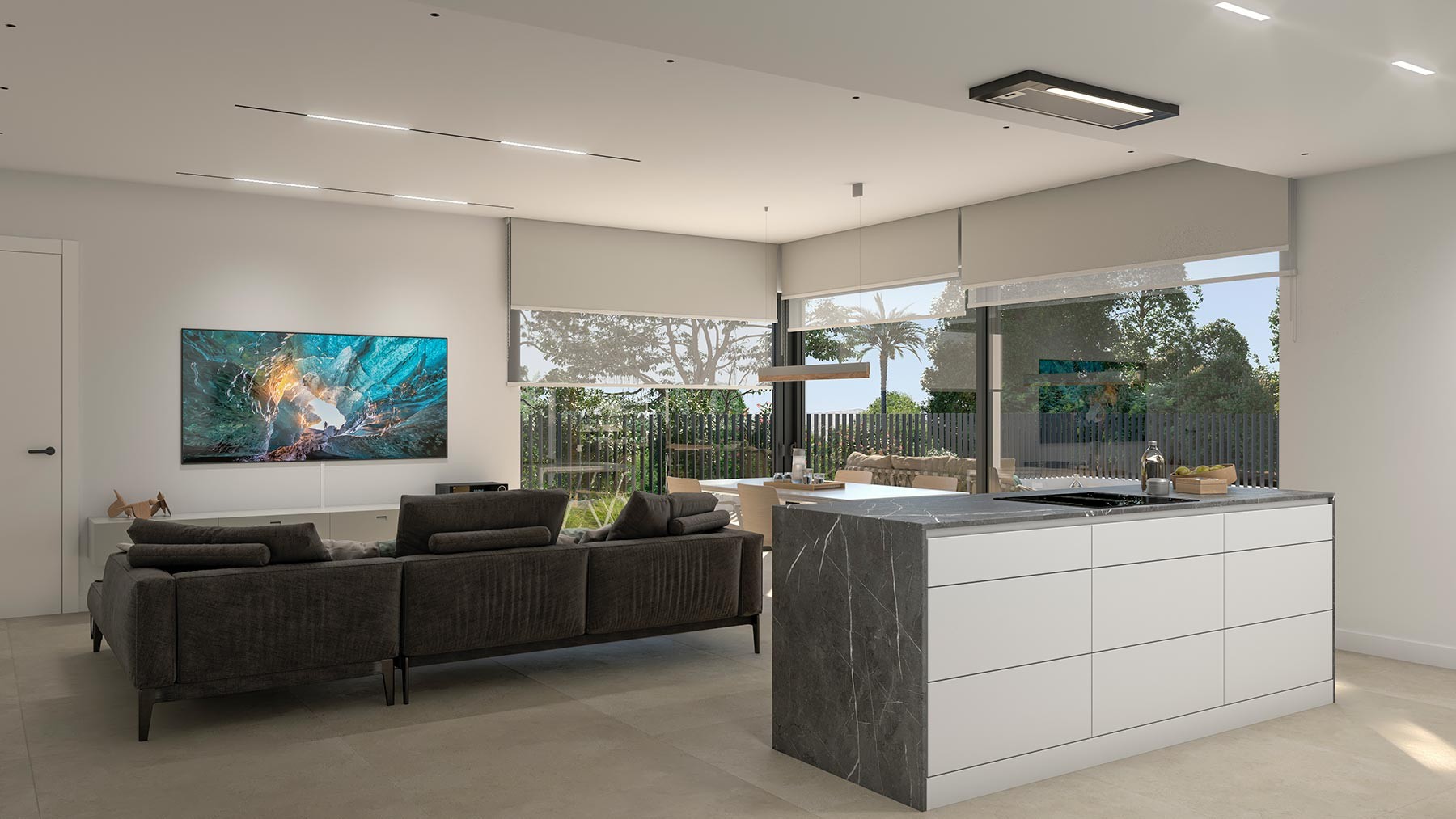 Dodatkowo znajdują się w nich piwnica z garażem na dwa samochody, pralnia oraz 20-metrowa otwarta przestrzeń, którą można zagospodarować według własnych potrzeb. Ponadto na górnym pokładzie znajduje się solarium, idealne do cieszenia się słońcem i panoramicznymi widokami. Do nieruchomości przynależy również duży odkryty taras z prywatnym basenem i panelami słonecznymi zapewniającymi efektywność energetyczną.