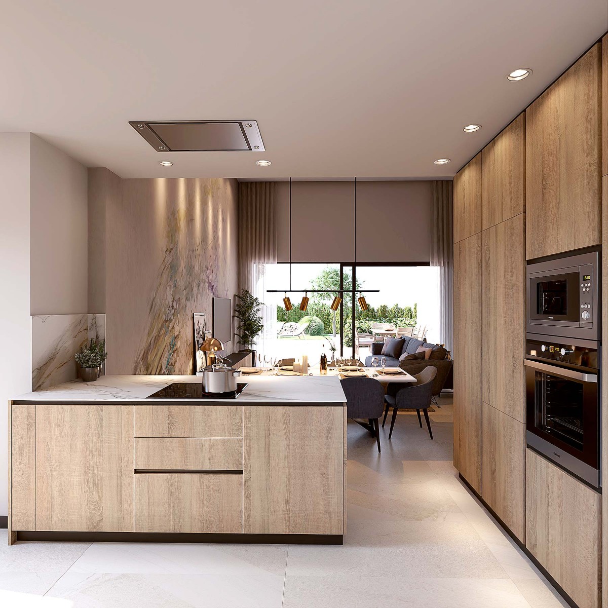 Його чудова, сучасна кухня в землистих тонах гармонійно поєднується з дизайном решти будинку, вирізняючись високоякісними матеріалами та великою кількістю місця для зберігання речей з дверима від підлоги до стелі для додаткового простору, що підкреслюється відкритим плануванням та природним світлом, яке заливає будинок на кожному кроці.